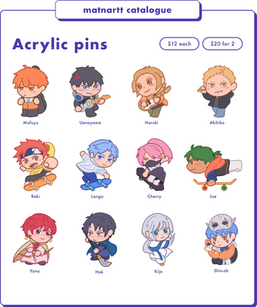 Stickers, keychains and photo cards of characters from my favorite anime, games and Kpop group.
